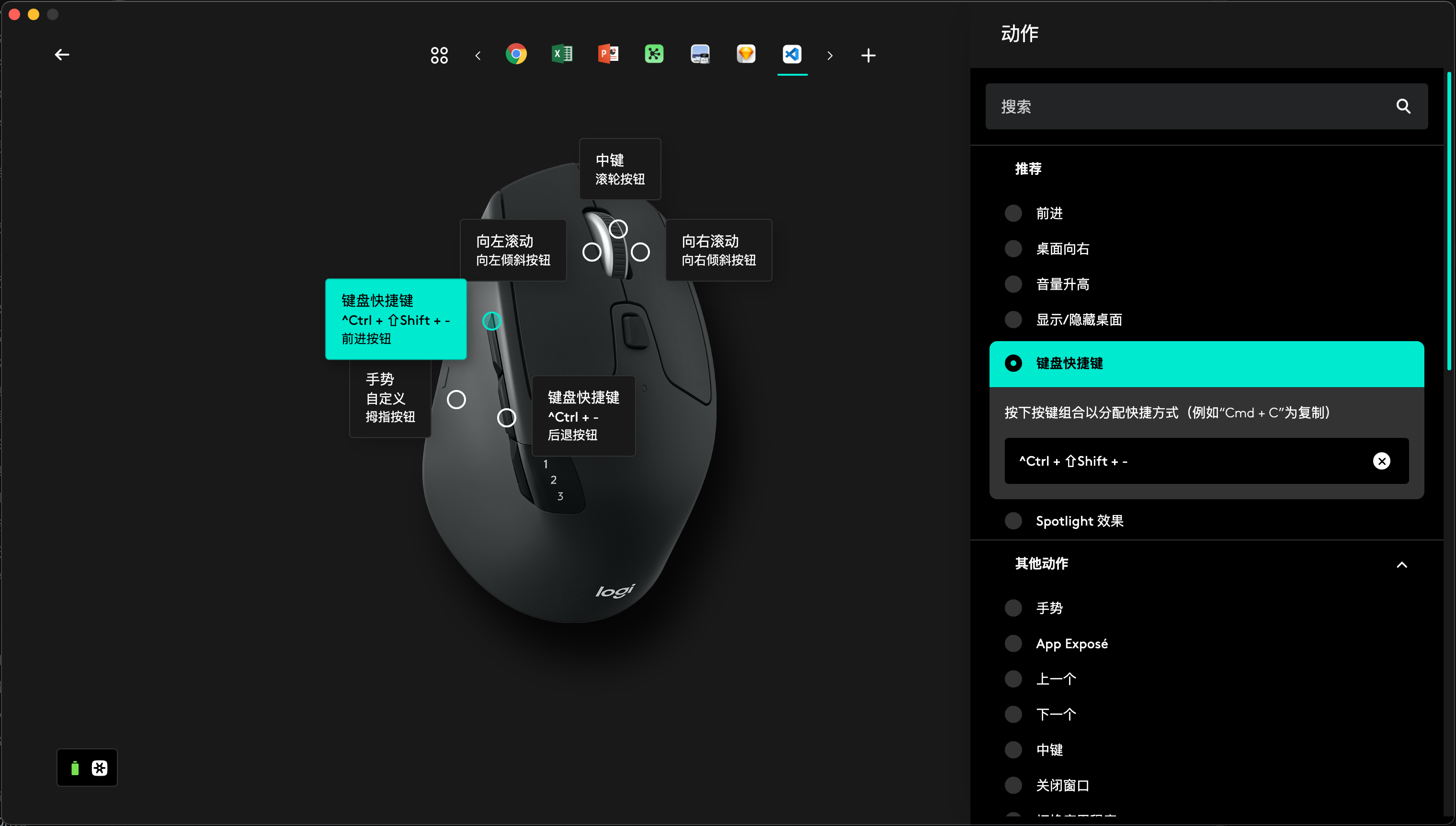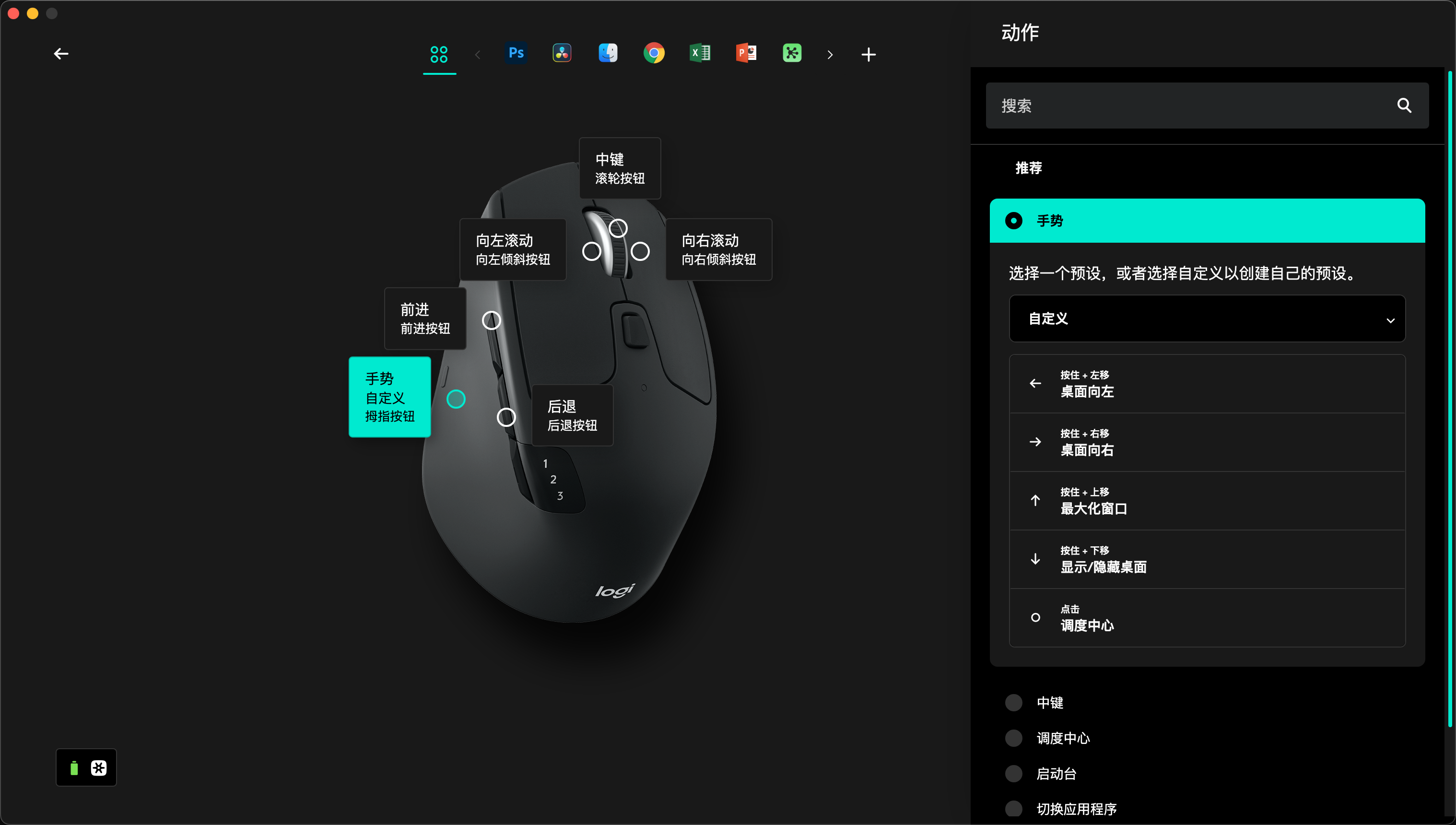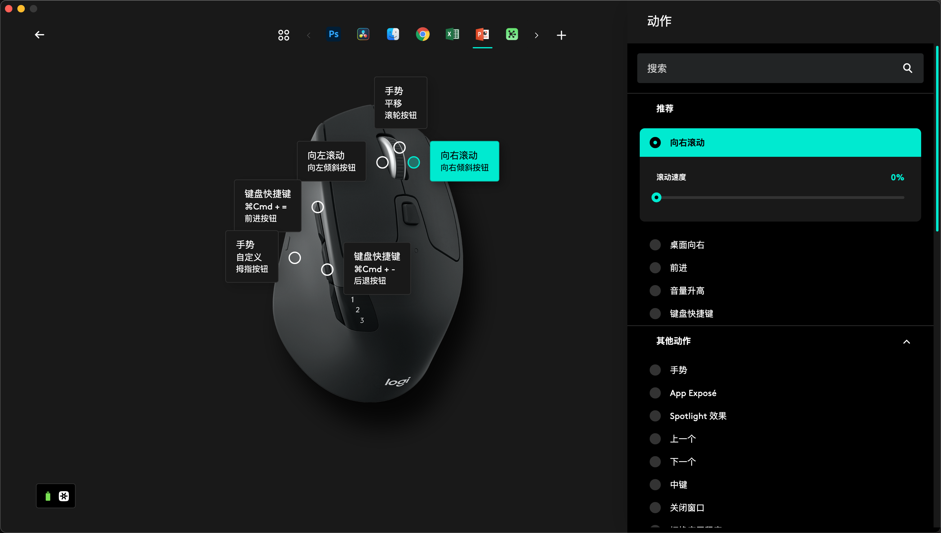 - 但是不支持 Logi 的 HID++,识别不了手势按键。